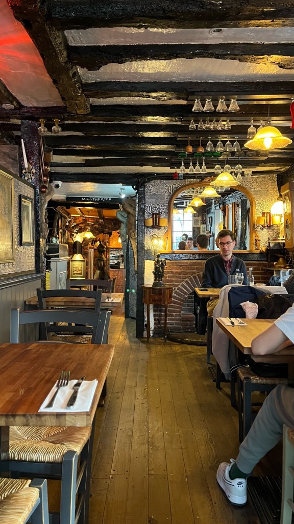 We finished off the day — my last day as a non-pilgrim, I suppose — with a glass of Kent sparkling wine at Corkk, next to our hotel. Allegedly, due to climate change, the weather and soil in Kent is reminiscent of what it was in Champagne years ago. We had dinner in town and then retired to the sounds of drunk teenagers seeping through our hotel window — a real throwback to my Trastevere apartment.