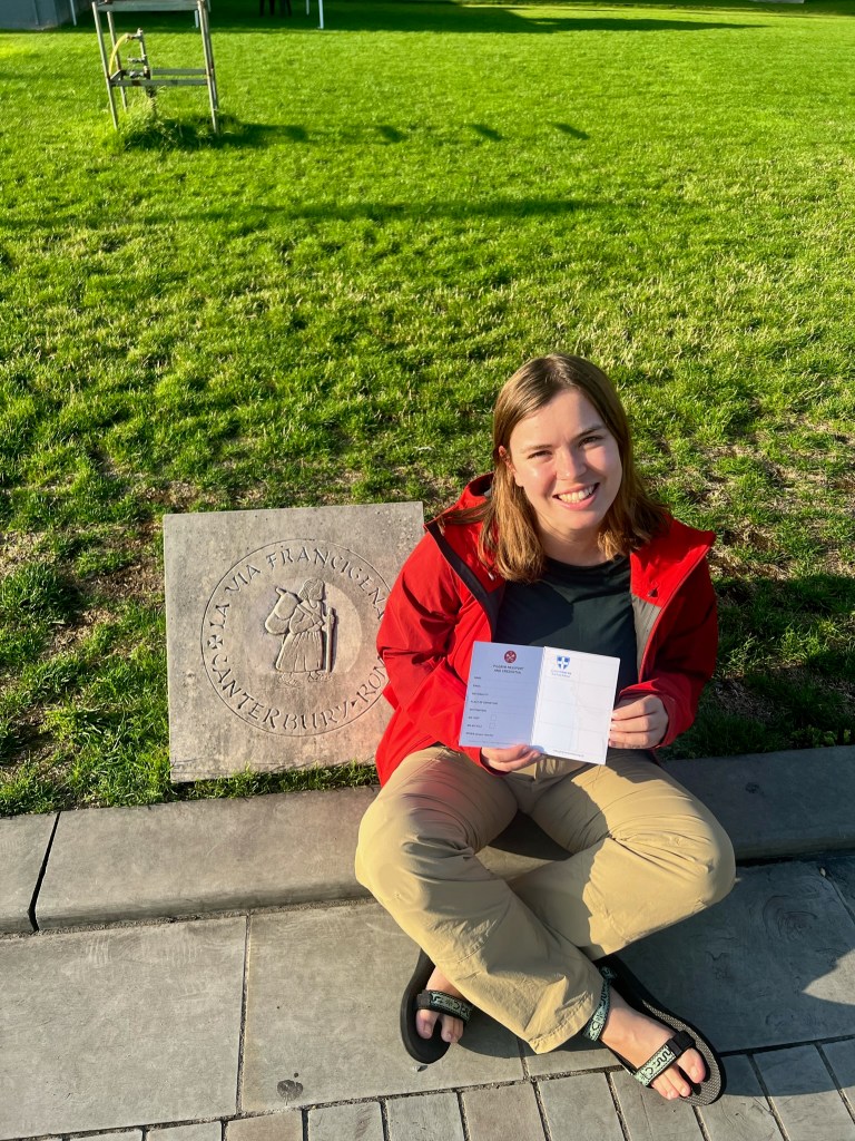 I almost left the Cathedral without — gasp — getting my first stamp in my pilgrim passport. Thankfully, Nathan was able to run back to our hotel room and grab the credential, and I departed the Cathedral ready for my walk to Sheperdswell the following morning.