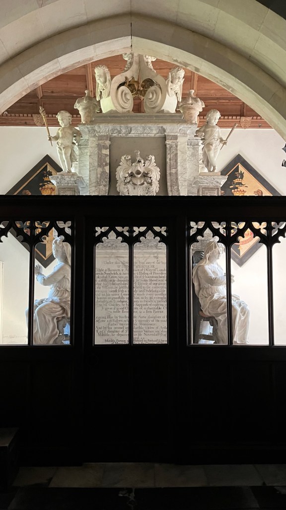 In addition to more rolling fields, today also included more forested sections. Emerging out of one such section, I was surprised to come upon the yard of the All Saints Church in Waldershare. The church is no longer in use, but is open for visitors and has a place to stamp your pilgrim credentials. The churchyard was a lovely and peaceful place, and I decided to rest there for a few minutes. It was remarkable seeing some of the older graves, now standing akimbo after over a century. Coming from a relatively young country, despite my time living in extremely old cities in Europe, I still am sometimes astounded by villages with such clear ties to the past. In a similar vein, I was taken aback by the ornate (and massive) tomb for a nobleman that sat inside the church — see below for the inscription.