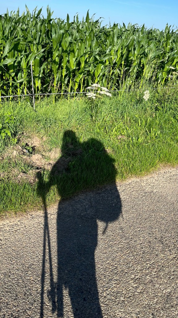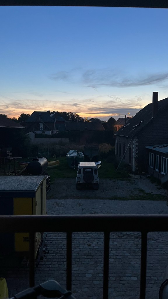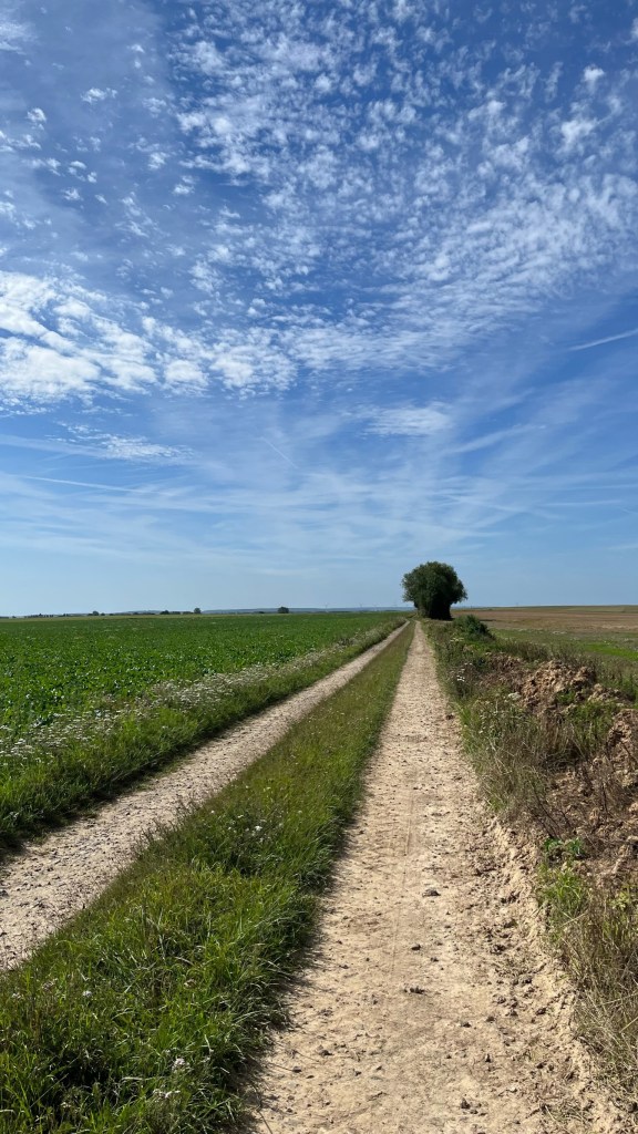 I didn’t sleep very well in the gite last night — my room had no air circulation, and I went to bed warm, even though I was only tucked into my thin sleeping bag liner. But I then woke up at 1am freezing cold, in search of a blanket (unclear if it was clean – the sheets did not seem freshly laundered) to layer over the bag liner. Given the broken sleep, I very slowly started to get ready: doing my stretches (my bad hip was starting to ache again, as I slept on it weirdly in Peronne, or maybe Bapaume), packing up my clothes, etc. I went down to breakfast with Krista and Hubert, the owner of the gite. Over bread, butter, and mint tea, we discussed plans for the day. Hubert told us that he had hosted his first pilgrims in 1996, a group of Brits and Italians laying the original VF track. He still had photos, and he showed us an Italian newspaper from the 90’s discussing their trip. Very cool! Hard to imagine people undertaking this journey in the ‘90s without the benefit of GPS or an official route, though of course medieval pilgrims had even fewer options in terms of navigation (and at least ‘90s pilgrims had quick-dry clothing!).