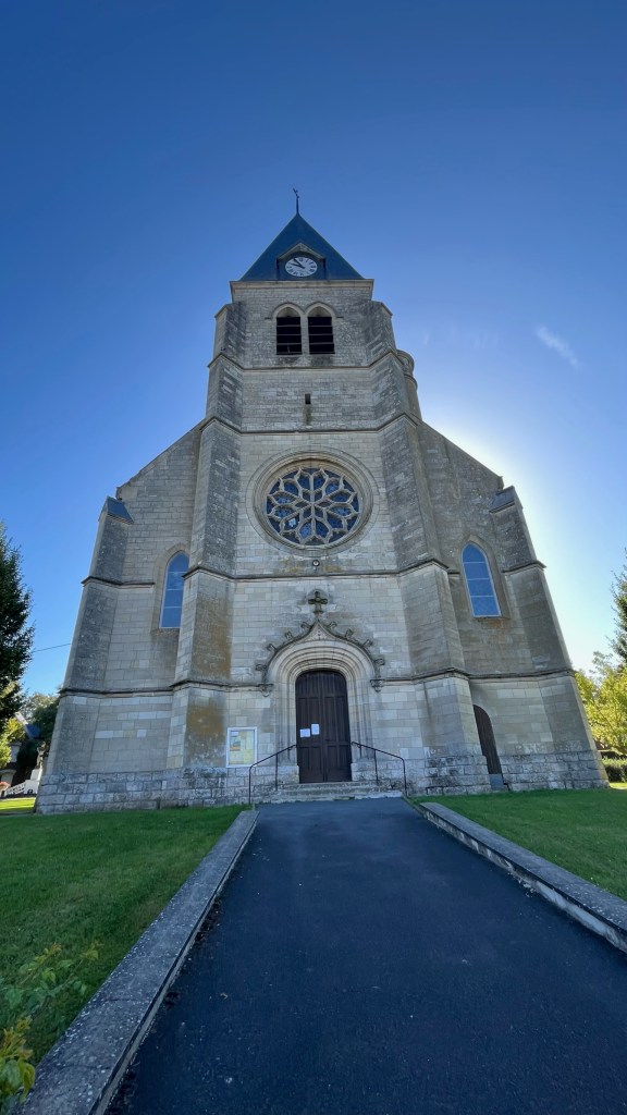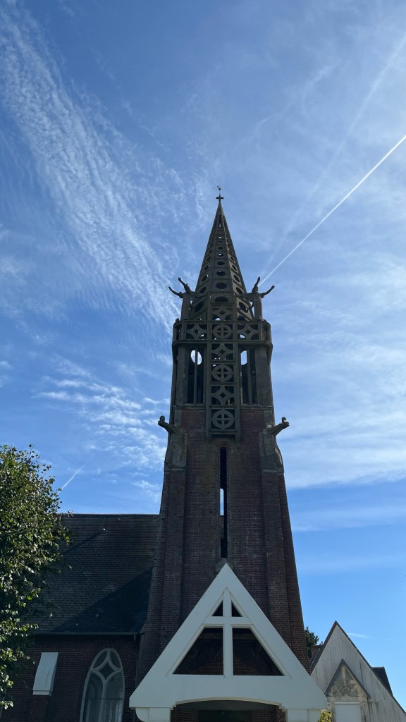 After finishing up packing, Krista and I headed out together out of Trefcon. The way was extremely flat, and even though we got a later start than typical — we were probably on the move by 8:45 or so — it was still cool and we had the sun in our eyes as we walked. We continued on for a few kilometers, talking about politics and work, before our paths diverged: she was off to St. Quentin and then home to Belgium, I was taking a shortcut to Seraucourt. We said our goodbyes and bade each other a safe walk, and then I was on my own again. I would miss having a familiar face and the company at our various accommodations. The first half of the day was easy — extremely flat, more fields, not much new to say about the day. I got into Etreillers, with its impressive (and locked) church, with no issues — unfortunately though the town has two cafes, both are closed on Mondays. I paused for a bit in the park before continuing on to my next stop, Roupy. The town seemed almost completely deserted, so I sat on the steps of the church to air out my feet and eat the orange I had been carrying since Arras. The last few days, all the churches have looked similar in their brickwork (probably a function of them being rebuilt postwar). But while Etreillers had a large stone church with what is probably a lovely a rose window, the Roupy church had a steeple which made interesting use of negative space (see below).