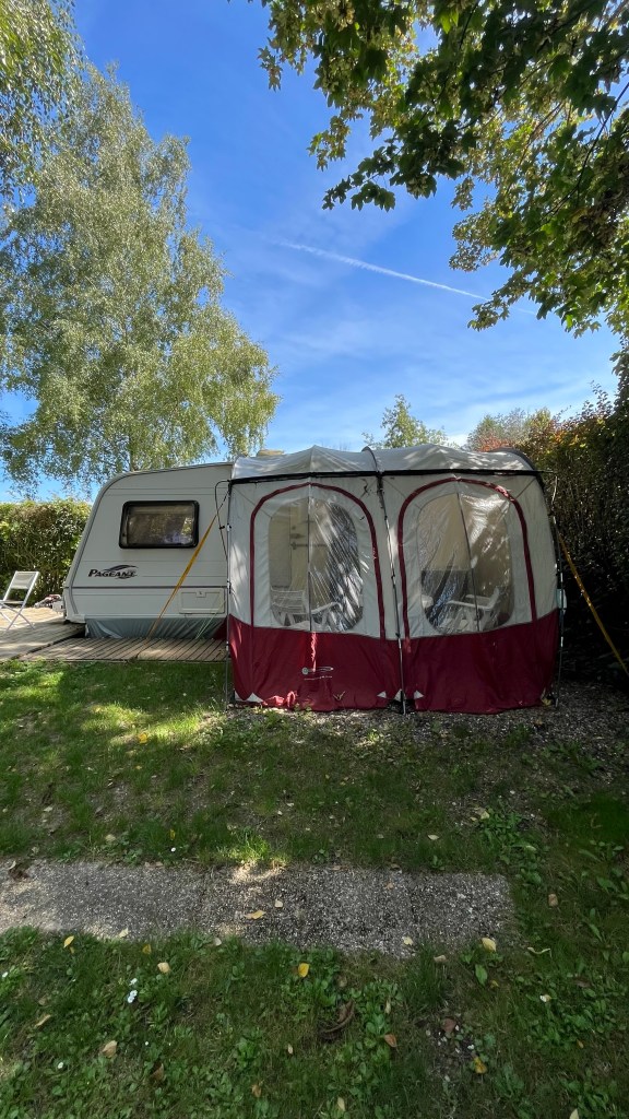 Tonight I am staying in a campervan at the Seraucourt campgrounds — and I have to say, the combination of the shorter day and the accomodations have been delightful. I arrived at around 12:30, checked in and got my stamp, and spent an hour or so unpacking my bag and reading my book (The Seven Husbands of Evelyn Hugo, which I devoured in 2 days). I swung by the pool for a quick dip, and the central building for a shower before heading back to the campervan to read and stay out of the sun. It’s been fantastic having so much time — I hardly know what to do with myself — and I’ve spent it mostly hanging out, trying to stretch my aching hip, and exploring the campgrounds with an ice cream in hand. The grounds back onto the Somme river, so there are some lovely views from the walking paths. But I’m also content to sit at my patio table outside the camper and read. Time seems to move more slowly here with not much to do other than relax (fifteen minute increments marked by the church bells, which bizarrely toll in a minor key) and scope out the other vans. There are people here from France (obviously), but also Belgium, the Netherlands, and the UK. Lots of families and retired couples — everyone seems happy to be here.