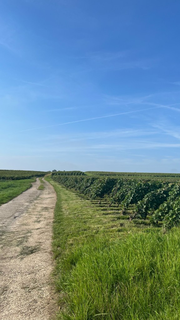I descended from the massif onto the flat farmland below, swapping out Champagne vines for my familiar friends: sugar beets. I passed few cars on the road and a few cyclists. I turned around briefly and could see the monastery through the trees, with the vineyards below it.