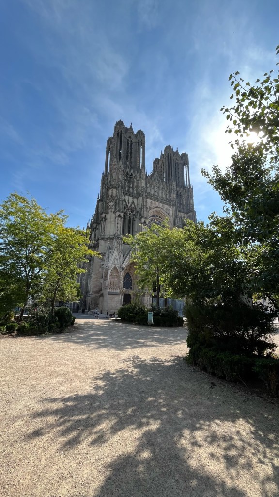 This is where the big-city thing became a bit of a problem. If youโ€™ve been following my journey so far, youโ€™ll know that basically everywhere I have passed through has either had nothing open at all, or at best one restaurant / bakery to choose from. I havenโ€™t had to really think much about where to eat since Arras (even that had limited options) and before that Dover. Reims, being a large city and a popular day-trip from Paris, has a lot of restaurants, most of which were open, even in August. All of them were more expensive than anywhere else I have been on this trip (excluding the Bapaume hotel restaurant). I was facing decision paralysis, I was hot, and I was hungry โ€” a lethal combination. I finally decided to walk 10 minutes to a bistro I had seen a recommendation for, only to arrive and find it was closed, though Google said it was open. I could wait 30 mins and see if it would open at 12 (likely, but not guaranteed given it is August), but there was no where in the shade to sit, and no cafes nearby. So I trudged back to the Cathedral and sat down in the shade, hangry, to figure out where to go next.