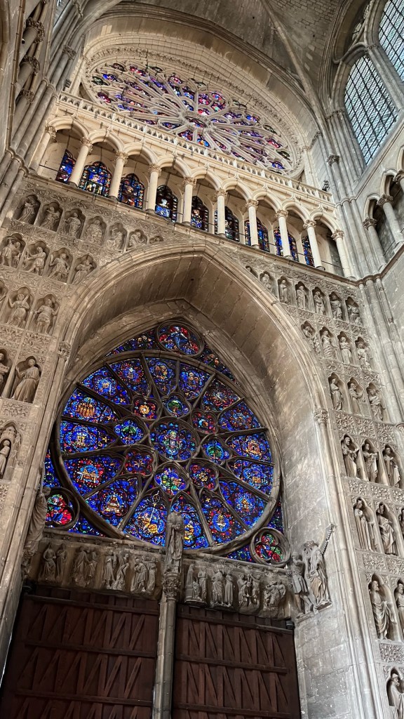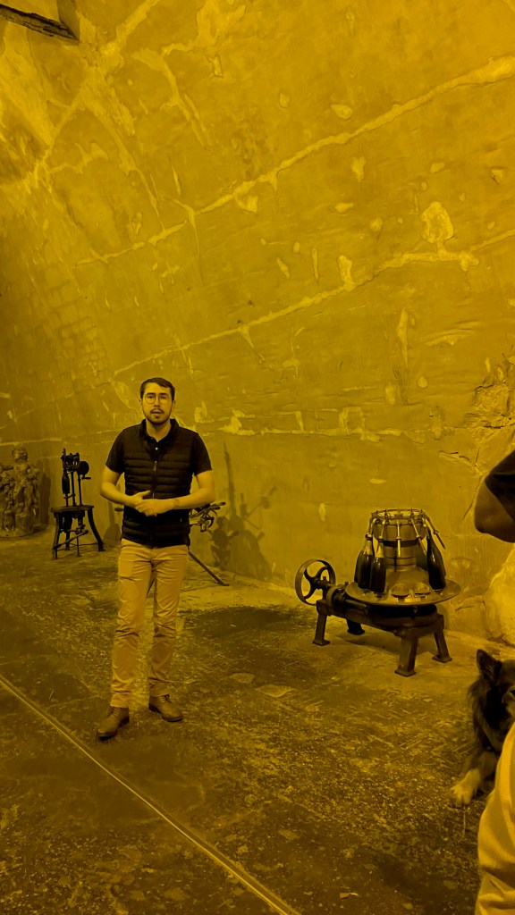 After a shower and some rest, I headed back out. First to the Cathedral, where I signed my name in the pilgrim log and received my stamp. Then I caught the bus across town to GH Martel, a champagne house founded in 1869 by a German man, and then eventually taken over by a local family. Theyโ€™ve built a substantial business through acquisition of other small houses. The tour itself was interesting โ€” we were brought down into the chalk caves where wine used to be stored (they now have a premises in Epernay). The caves used to be chalk quarries, then were used to store beer for a brewery, before eventually being used for Champagne. He also walked through the steps of making Champagne in limited detail. This information I knew already from my WSET course (which, by the way, I just learned a few days ago that I passed with distinction!) but it was very cool to see the bottles up close. They also had a cellar, now empty, that had been reserved for bottles created for Maximโ€™s restaurant in Paris.