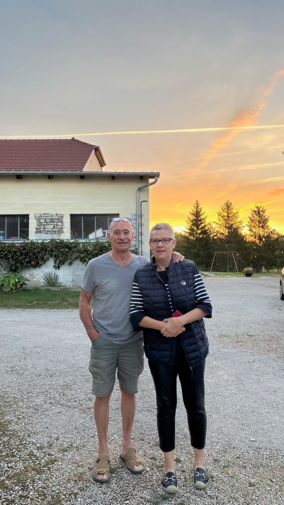 I shared an early breakfast with Claudine and her husband Charlie, bread with butter and their homemade apricot jam, which was absolutely delicious. Outside of the kitchen window I could see the clouds start to turn pink in the early sun. Claudine took a few more photos of me on my way out, and I snapped a photo of her and Charlie with the rising sun. Then I was off toward Busey-le-Gy to rejoin the VF trail.
