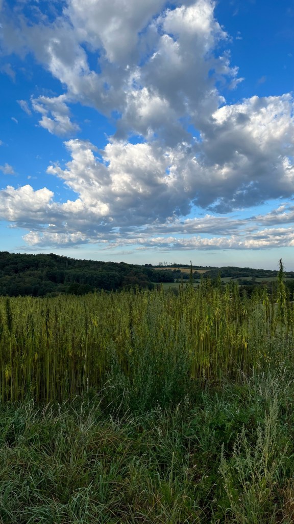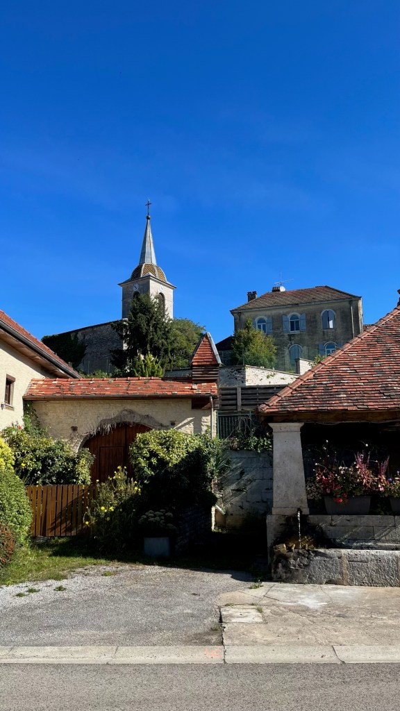 I finally left the forest and descended into Montboillon, ready for a chance to sit and a snack. I ended up perching by the town’s lavoir to have an oat bar and a peach. I packed up, washed my hands in Montboillon’s prized fountain, and headed up another hill out of town. On the way, an elderly couple came out of their house to say hello, and offered to walk with me until the path’s turn off. We chatted a bit about my planned route and they said they often had pilgrims staying with them on the way to Besancon. At the turnoff they bade me a bonne route and I was out in the sun, which had gotten quite hot though it was not yet 11am. Oh, did I mention there is another heatwave coming? Really, I can’t catch a break!