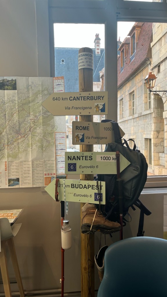 Post-massage I went for a quick lap around town despite the heat. I was surprised by how lively Besancon was. There seemed to be a lot of tourists, and it has two parallel high streets lined with interesting boutiques and French brands. I decided to save my sightseeing for tomorrow, but did swing by the post office to pick up a tourist map, where I saw they have signs once again noting the progress on the via Francigena. Canterbury: 640km, Rome: 1050km. Is it possible that I’ve already walked so far? Yes, there have been a few trains involved but even so that means I’ve walked over 500km. I’m simultaneously proud of the accomplish and a bit daunted by the idea of having another 2 months or so ahead of me. Not to mention the minor thing of crossing the Alps!