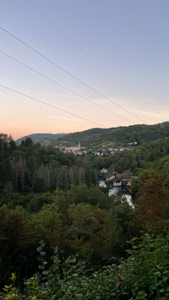 After finishing packing and a quick call with Nathan, I left cash and the keys for the pilgrim gite and was out into town. Exiting Mouthier I once again passed the church and epicerie in town, before heading down a very steep, gravelly downhill toward the Loue that had me carefully watching my footing.