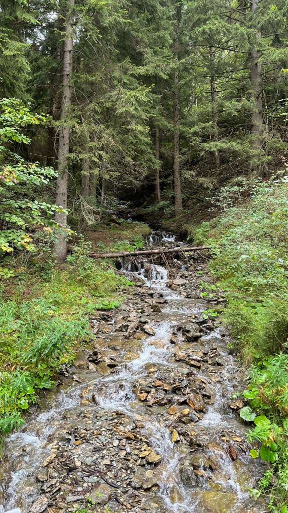 I was extremely grateful for the late start today. I desperately needed the sleep, and maybe more importantly, I needed to eat a real breakfast. I haven’t seen a supermarket since Orsieres and my supplies are dwindling. And the meals at the hospice, while lovely in terms of company, were modest portions for this hungry walker. So, my alarm went off at 7am and I spent a few minutes laying in bed, watching the low clouds cling to the pine trees on the mountain outside. Beatrice and Daniel were up and moving so I went about packing my bag and getting ready for the day.