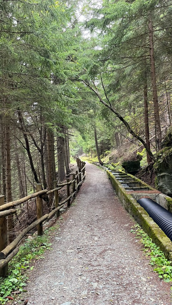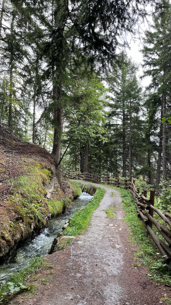 Back on my own, I followed the track up a steep and wet grassy hill, where I rejoined the Ru Neuf irrigation canal, which dates back to the 1400s. Though the canal was sometimes built up in a cement channel, for the most part it looked more like a mountain stream that happened to have very even banks. The path meandered along next to the canal, covered in a soft bed of pine needles and punctuated by trees and boulders. This was some of the most meditative walking I’ve had in awhile, and with limited threats to life and limb I enjoyed letting my mind wander and appreciating the scenery. And, I was far enough from the road to get a bit of quiet, with the only sounds my feet on the trail and the rushing of the canal.
