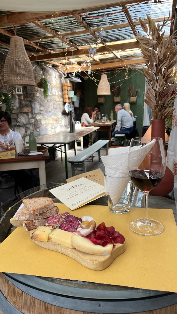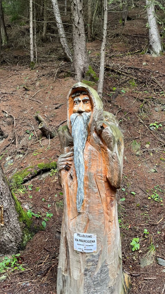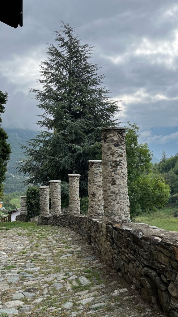 I ended up ducking into a lovely wine bar with a massive selection — I had a board of local meats and cheeses for lunch, paired with an Aosta red wine of primarily the Petit Rouge grape. It was tasty, and a definite departure from the lightweight Swiss Gamay I had been drinking, with clear notes of vanilla from its barrique aging, in addition to the red fruit, dried herb, and earth notes. I ended up chatting with the husband and wife proprietors, as she was curious to know how I had ended up in her shop. When I told her I was American, she looked at me, confused, and asked “…but your accent [in Italian], it’s not so bad?” High praise, and she seemed to accept my explanation of having lived in Rome a bit. She and her husband had walked some of the Via Francigena, and he was a trail runner, so they also offered some recommendations of stores to look for shoes tomorrow.