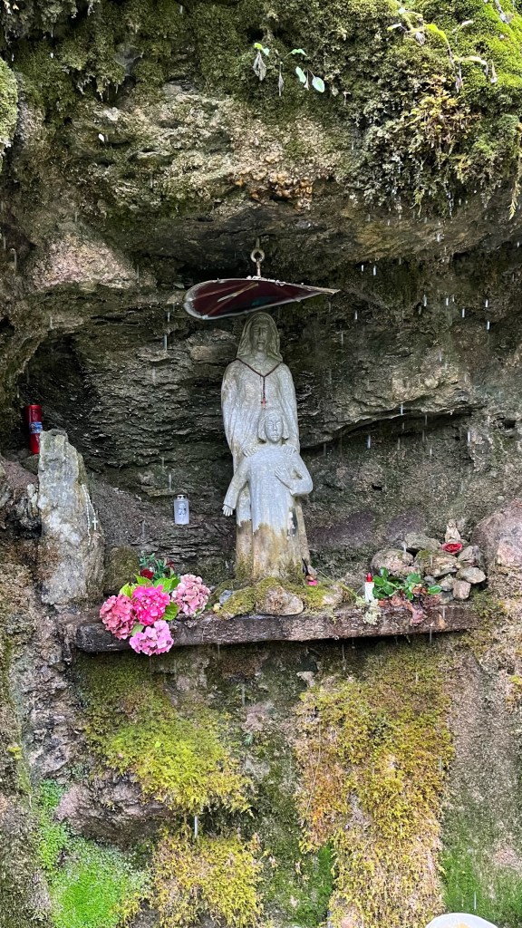 There were a few points of interest in this section, including a gigantic wood carving of a pilgrim — I don’t see the resemblance. Also, a religious shrine in the Je Te Salue grotto: a statue of Jesus and Mary placed under a rock. Water runs down the rock from the mountainside, meant to represent the waters of baptism. I got a few drops on my head as I scoped it out before heading onward. From here I diverted from the canal on to a regular gravel trail. Frustratingly, I could hear the loud sounds of cars — it sounded like someone was drag racing up the valley, except that the sounds continued on for at least 20 minutes, I was missing the F1 race today, but it sounded like it was happening right below me!