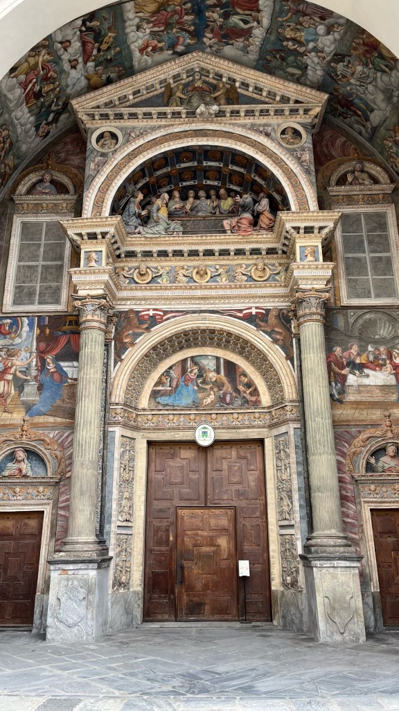 The clouds were still thick, though no rain was expected today, so we had limited views across the valley. But we could see through gaps in the cloud cover that ahead of us was a massive mountain which loomed over the town of Aosta. We stopped for a moment at another lovely frescoed roadside church, before crossing the highway and taking a side road up through vines and fruit trees, past a power station, and then finally down a long, steep set off straight-downhill streets into Aosta proper.