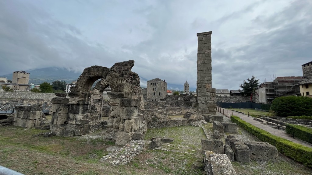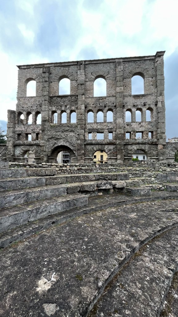 After breakfast (by the way, another surprisingly good cornetto — I guess I am glad for the French influence), I went for a wander and ended up at Aosta’s Roman theater, which was free to enter for the day. I took a lap around the ruins, which are still in pretty good shape all things considered. Aosta was founded in 25 BC as Augusta Praetorium, and many of the landmarks including the Roman walls and arched gates remain. The theater had a number of informational panels highlighting other Roman ruins on the path I will follow in the coming days, including the famous Roman Road and arch outside of Donnas, and the bridge in Pont Saint Martin.