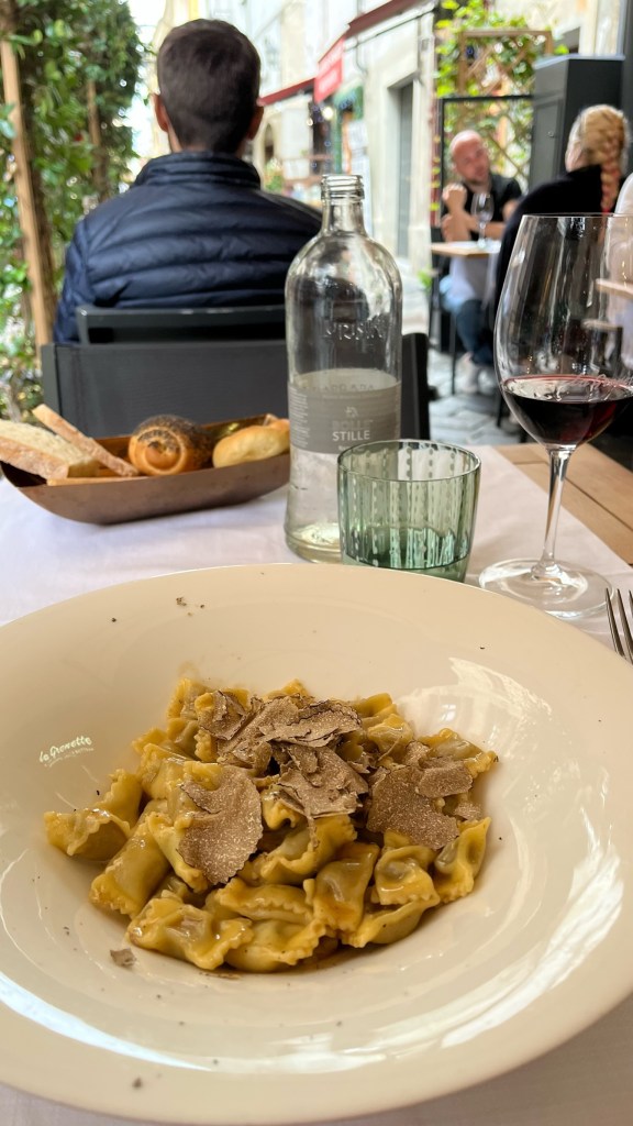 I then went to the grocery store to pick up breakfast for tomorrow as well as some needed items, including a toothbrush and some white vinegar, which I was hoping to use to clean out my camelback tube again and also to try and remove some of the ickiness of my pack straps, which suffered greatly during this latest heatwave. That done, I stayed in the Airbnb for awhile hanging up my laundry and cleaning, and took a quick nap. I headed back out for lunch at a restaurant in town, where I had a delicious bowl of agnolotti del plin and a glass of wine.