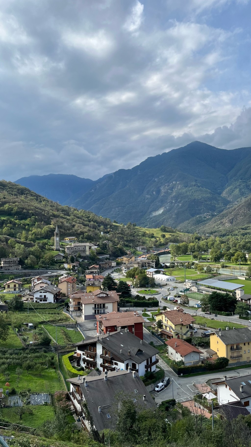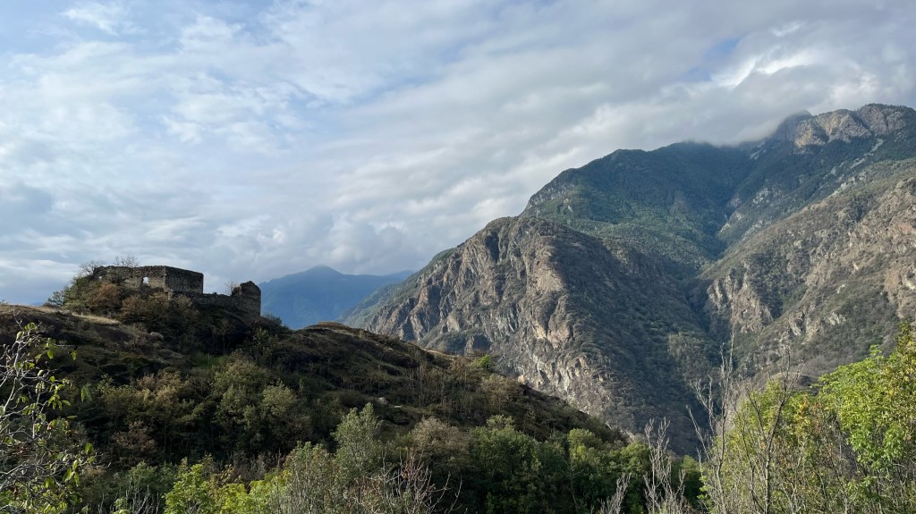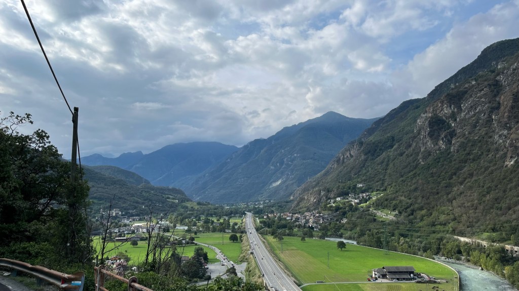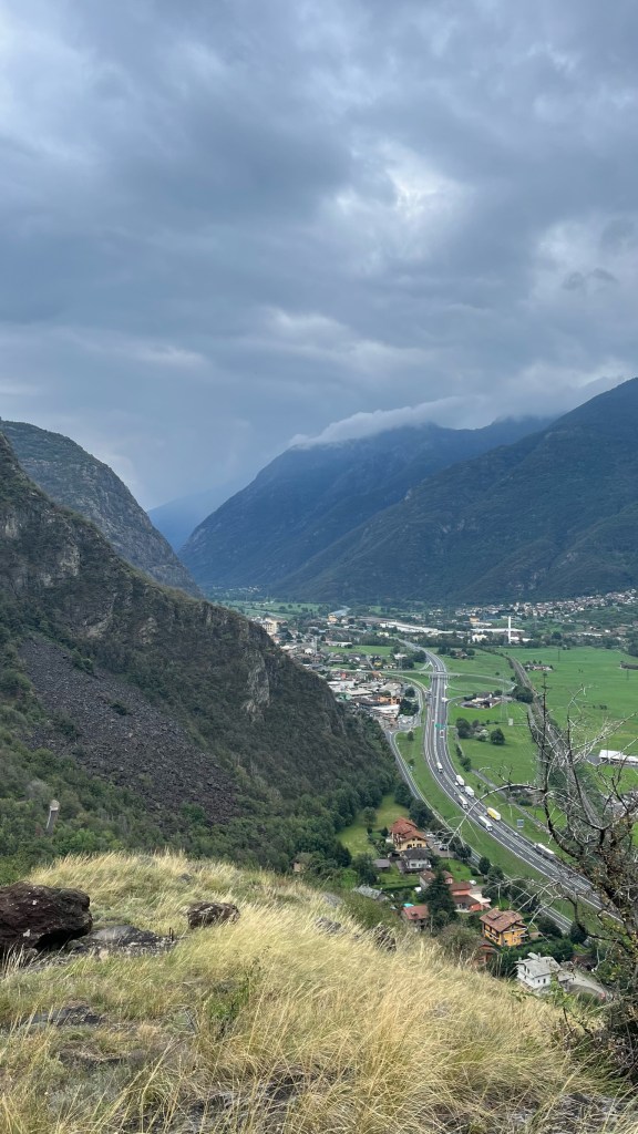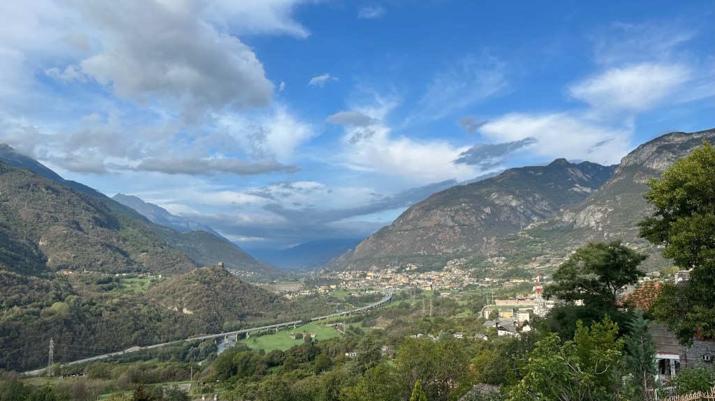 I managed to find the path out of town with some difficulty, thanks to a heads-up from Patrick who noted that it cuts behind a house, through a construction site. I passed alongside the backyard of a family who was breaking down a tree into pieces for firewood — a group affair as the woman would break sticks into sizable pieces, one of the men was using a handsaw, and another a chainsaw. Stepping well out of the way of the blades, I headed up a steep, rocky path through the forest, only to then crest a hill and head back down a similarly steep and rocky section. I picked my footing carefully on the downhills and huffed and puffed my way through the uphills. But again, I just climbed the Alps — nothing I can’t handle. After a few rounds of this with the ascents and descents becoming progressively longer, I finally emerged atop a hill covered in brown grass, blowing in the wind as rain clouds moved in. Below I could see a town — not quite Verres, but the town ahead of it where I would rejoin the valley floor.