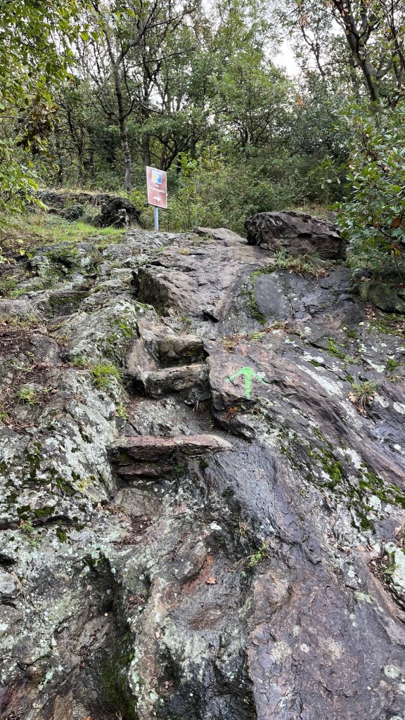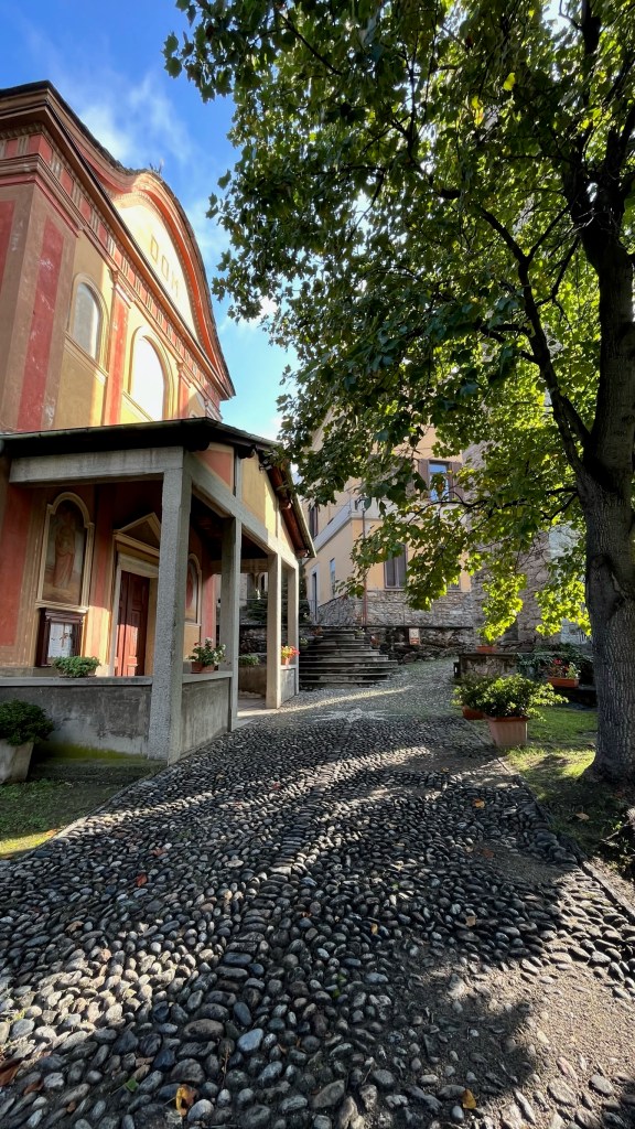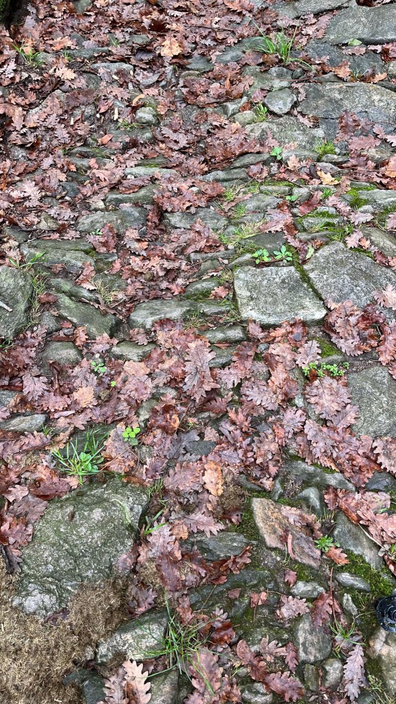 The next town I passed through was Settimo Vittone, which seemed to be almost abandoned as a walked up past uncultivated fields and crumbling stone walls. The VF path actually didn’t seem to want me to spend my money in town (a rarity, given it normally detours to pass a bar whenever possible), so after climbing a grassy hillside path and snapping photos of the town’s church, I snuck behind its buildings on a slowly sloping downward path alongside fields and large rocks. This path took me briefly off of the gravel track to hop over some rocks in the forest before immediately rejoining (“ummm…okay…” I wondered aloud) before ducking below a pergola once again, tiptoeing my way through what had once been the trail and, since last night, had become a small stream. This was followed by another scrambling section over rocks. Once again, this was welcome and interesting when going uphill, but significantly more difficult going downhill. Sometimes this was more of a scramble, but at a certain point this turned into a road paved in stones and covered in a thin layer of wet leaves — a truly terrible combo. I prayed once again for the health of my knees and ankles and snaked my way slowly down, passing under an elevated obstacle course which looked like a lot of fun, ducking under an abandoned house, and finally arriving back in civilization where the path once again passed under pergolas.