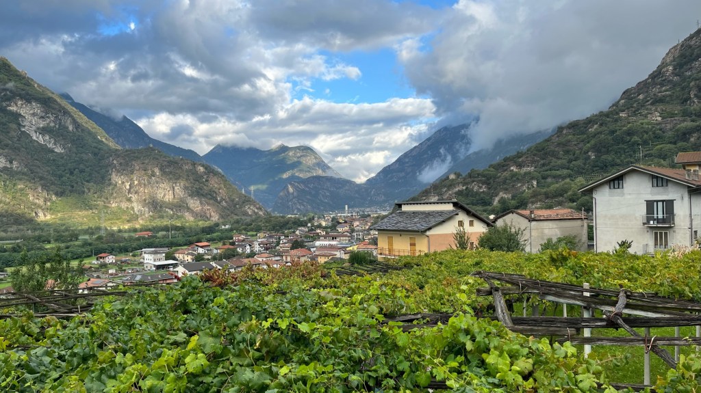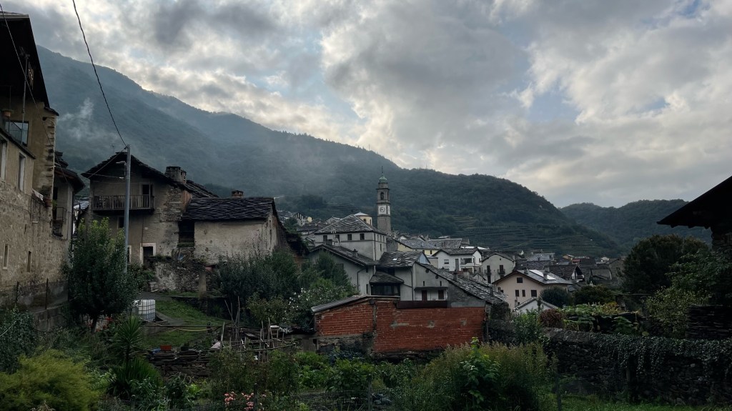 The last bit into Carema was a lovely walk under the pergolas of vines that surround the town, well-known in the region for its wine. I was very bummed to be missing its wine festival by half a day. I also had, at some point, unknowingly crossed from Aosta into Piemonte: on to the next Italian region! Carema has a well-preserved medieval centro storico: a glimpse inside someone’s open door revealed a ground floor that was unrenovated, with a stone floor and old wooden steps.