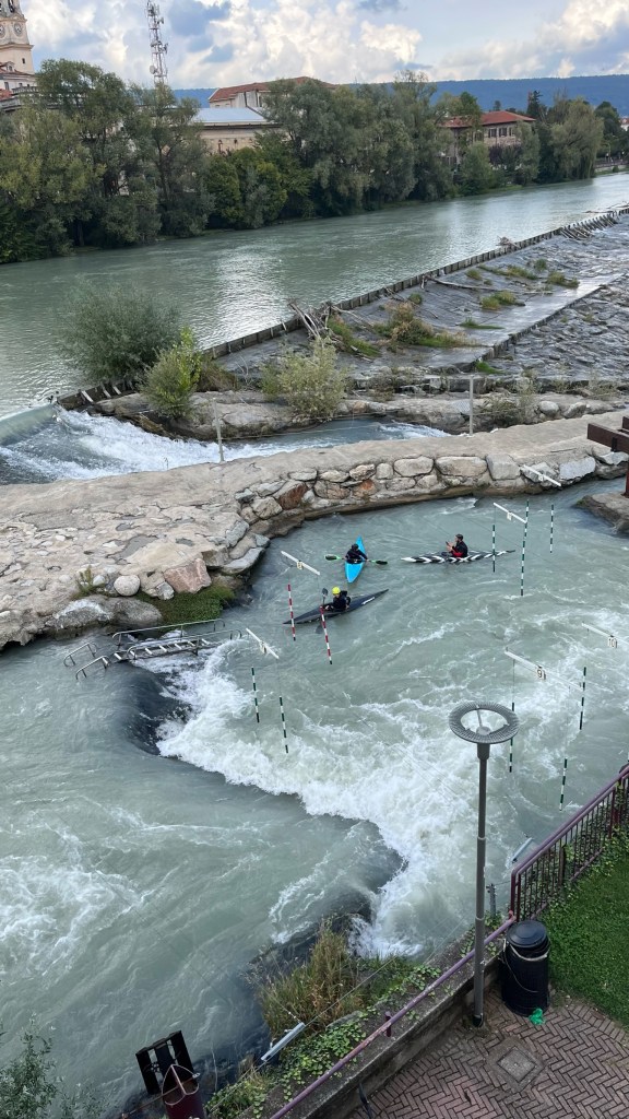 Leaving the church, I chatted with my mom for a bit, before settling outside a gelato shop to write. Just before 4:30 I headed to the Ostello to check in, and after sorting out some confusion regarding Leigh’s bag that she had sent ahead of her this morning (the messenger, finding the hostel closed, had hidden it in an outdoor fridge), was sorted in a dorm room overlooking the river, where kayakers were practicing slaloms in the rapids.