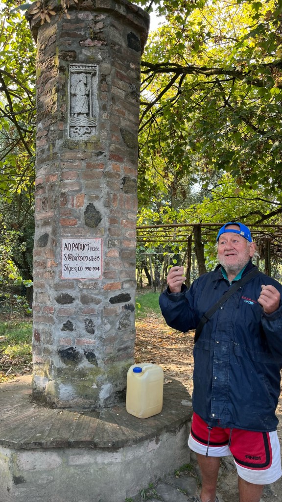“The normal dock is inaccessible,” Danilo said, “but it’s okay, there are some stairs here.” Suddenly he rammed the boat into the muddy bank. “Stay here,” he told us while he hopped off the boat and did his best to further pull us onto the bank, assisted by Daniel. After a few attempts, he figured we were all set, and one by one we put on our packs, jumped into the mud, and climbed up a set of “stairs” (pieces of metal sticking out from the dirt” to the bank. Once we were all safely on land once again, we followed Danilo to a garden near his home, where there was a column similar to one we had seen on the other bank. He gave us a short lecture on the history of the river crossing, used not just by Roman legions and medieval pilgrims but also by the Saint Colombano. He told us the story of Saint Colombano and Saint Gallo, who traveled south from Ireland together before splitting up in Switzerland after an argument. Saint Gallo’s remains live in a church not too far from here, and a few years ago a group of locals reunited the friends by bringing Gallo’s skull to visit Colombano’s skull in Bobbio.
