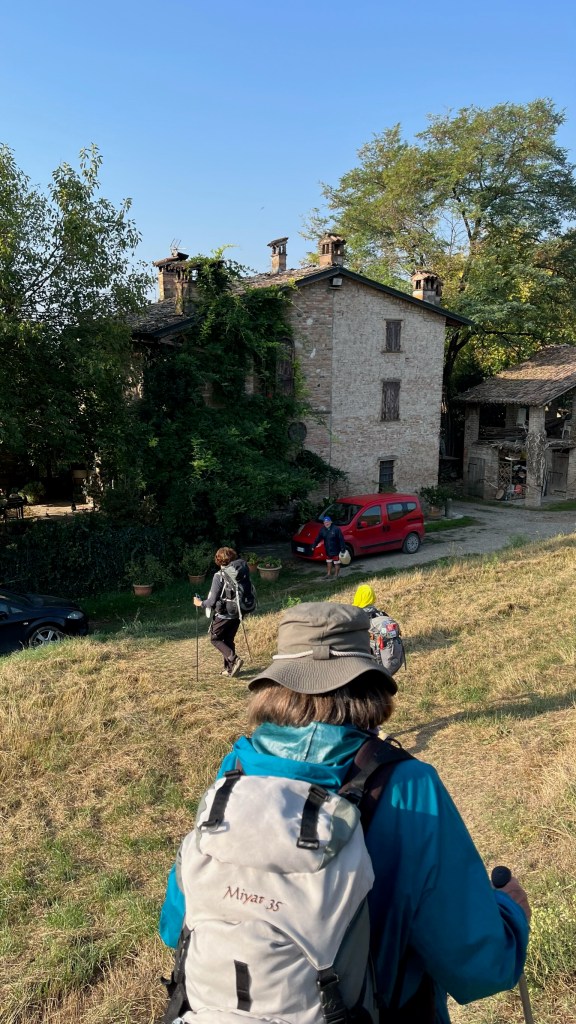 Following our history lesson, we made our way to Danilo’s house, where he brought out a massive book and what looked like a wooden doorknob. As it turns out this was his massive credential stamp. We wrote our names, ages, departure points, and destinations in the book. I believe I was pilgrim number 828 that he has ferried this year. He also asked our occupations which gave me a bit of a crisis (I forgot that I could simply put “unemployed” as an option, and also I don’t remember the word in Italian). After some internal debate I put “Consulente d’affari” which is a semi-accurate description of my last job at WFP. We stayed chatting with Danilo for awhile and he shared his statistics that he keeps, going back to 1998, when he ferried 2 pilgrims. Around 10am, we needed to get going, so we thanked him and headed on our way.