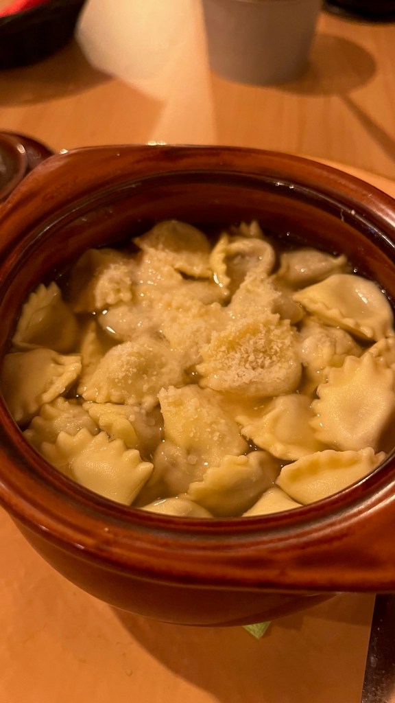 Unwilling to think or venture further, I went back to the same place for dinner as where I had lunch. This was a 3 course affair: a tartare with truffle, followed by more anolini in brodo, and then a delicious dessert that was basically a mini-apple pie, cooked in filo dough, served with gelato.