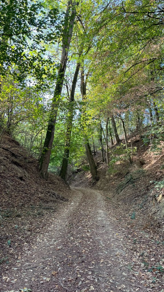I called my mom and then Nathan to take my mind off the heat, and soon was up a hill and walking over the extremely long bridge to Fornovo di Taro. This bridge spanned the Taro river — I assume at one point this river was wide enough to warrant such a bridge, which took 15 minutes to walk across, but today it barely looked like more than a creek. I wonder if it is always this low this time of year — I was surprised by the level after the very active Ticino and Po rivers. Either way, the view of the riverbed was beautiful, with some trees just starting to change colors (oh, right, it’s fall…). I snapped a few photos before continuing on and into the small historical center of Fornovo di Taro.