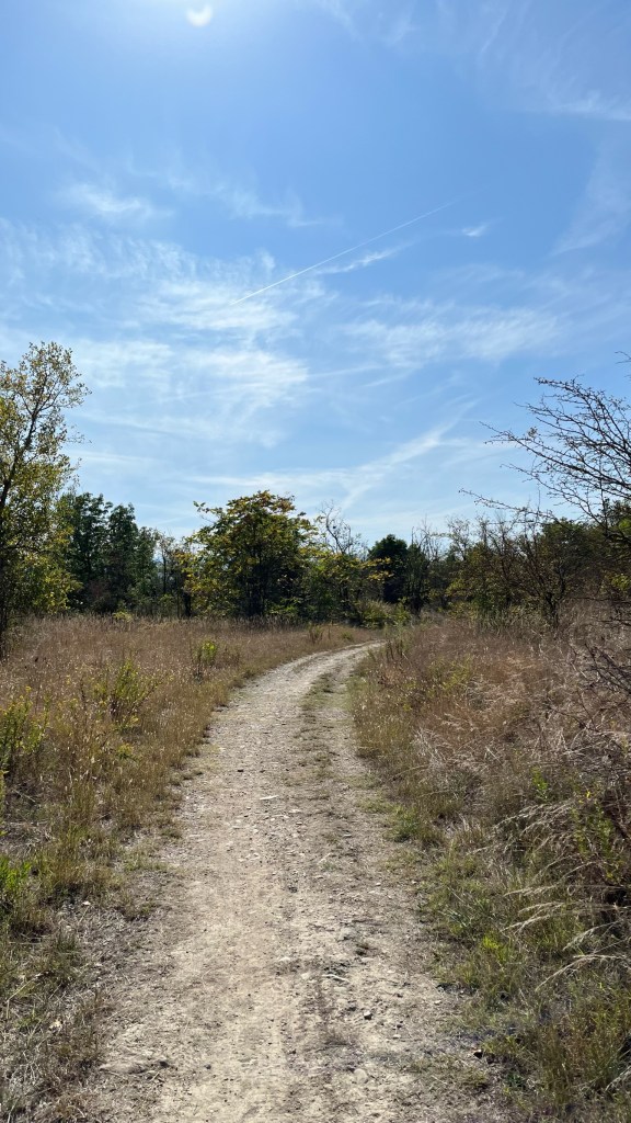 I turned off the asphalt onto a gravel road past farms, which had recently manured their fields. Two different unleashed dogs ran after me, urging me to stay away from their farms. Luckily these ones were all bark and no bite. I also saw something moving on the trail ahead of me and squinted to see what it was — another dog? Then it turned and came out from the tall grass and I realized it was a turkey! It was hanging out roadside with a few companions, all of whom quickly skedaddled back to their home as I passed.