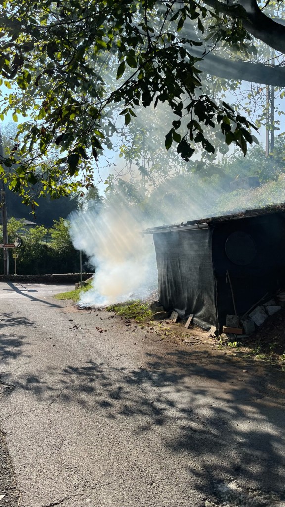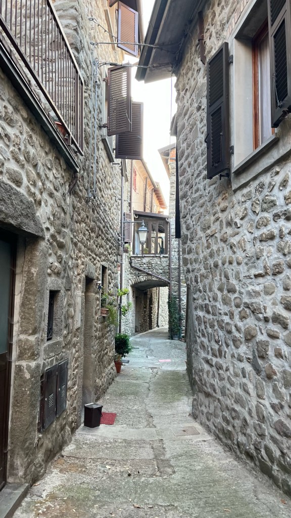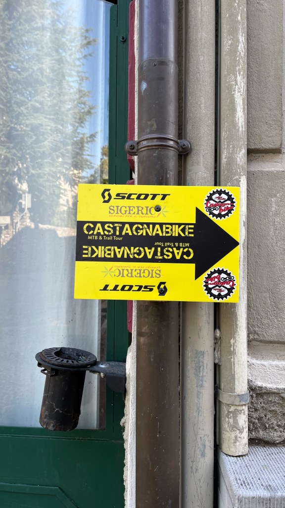 Then, quickly down a steep hill and into woods for a bit. We passed a few signs for a “Castagnabike” (chestnut bike) route, which reminded me of the “Tartufo Trail run” signs on the way into Cassio. All morning we had been smelling smoke — Nathan asked if it was a wildfire, but I said most likely someone burning something. I had walked by all sorts of rural fires in the last few weeks. We soon found our answer: a very old woman was tending to a large, smoking pile of leaves. We stopped to watch for a moment and she explained that she needed to do this to keep her driveway clean. With a confused nod we continued on into a lovely forested section (albeit with some somewhat painful up-and-downs). I promised Nathan we were almost at the next town, which was….sort of accurate.