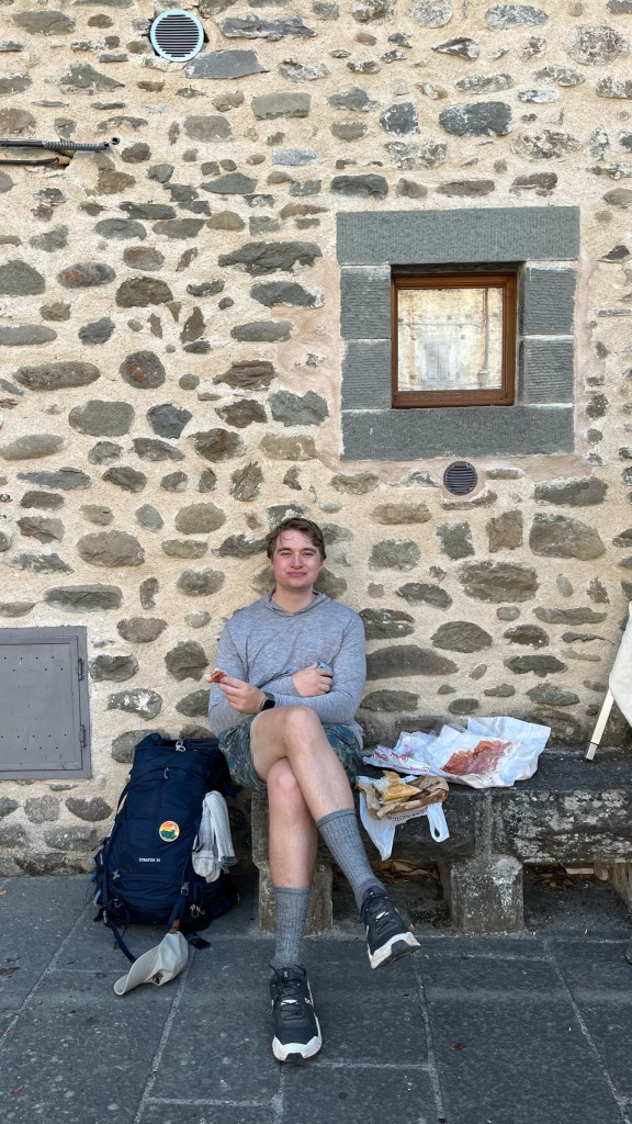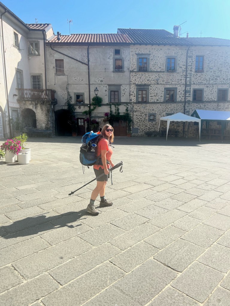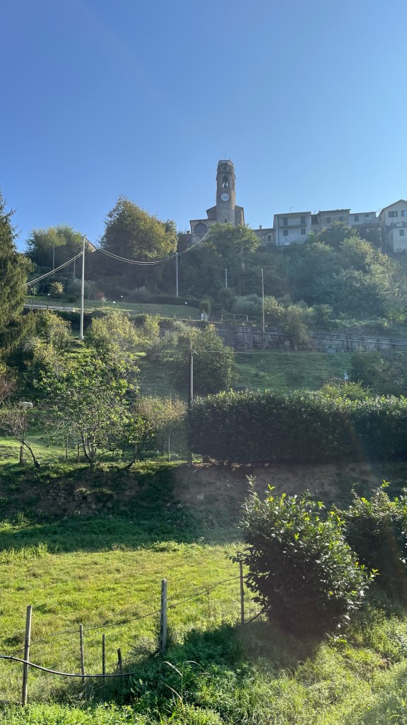 We got to the train station, bought tickets, and after a coffee break were on the quick ride to Aulla. Our B&B was called “Bed & Bike.” We realized why as we arrived and saw it was the top floor of a bike shop. I was very grateful for the B&B rather than the pilgrim accomodations today — the place was clean and newly renovated, with air conditioning, and had the nicest bathroom I have seen all trip. I relished this with a hot shower, and we hung out for a few hours before heading into town. The downside of this Airbnb is that it’s a 20 minute walk into town (more if a member of your party is limping) along busy roads with no sidewalk. But, we made it with no incident. Nathan ended up buying a pair of Birkenstocks in addition to the planned purchase of pain cream, and we sat at a gelateria for an aperitivo. Afterwards, we found a restaurant with availability for dinner. Unfortunately the menu was limited, so Nathan ended up ordering a carbonara (I refused, as I’m waiting till I get to Lazio) and I got the amatriciana. Both were decent (though not fully accurate representations of the Roman pastas). We failed, despite my extended efforts, to find a taxi to bring us back to the B&B, as Nathan’s led pain was starting to get worse. So, slowly, we made our way back to the B&B and to bed.