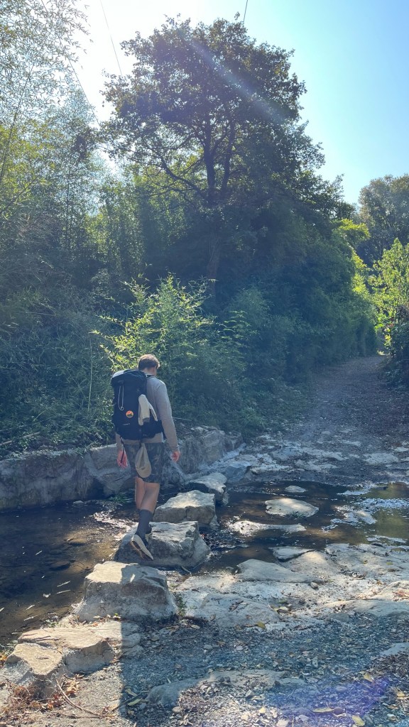 As we crossed a small stream, hopping over a series of stones, Nathan (who had been very stoic up to this point) started to make it clear he was in pain. I suggested we go have a long sit for lunch and decide if we wanted to continue or take the train the rest of the way, as we were near the mid-point train station. He agreed, and we continued alongside a field with the loud sound of blasting Italian pop hovering in the air.