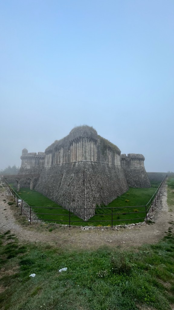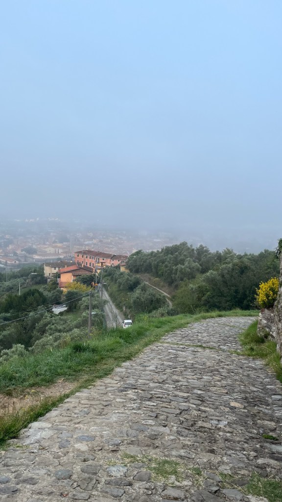 I walked with Nathan to the train station, seeing him off for his 8am train before heading back to find the trail in the centro storico. I was very sad to see him go, but quickly had to focus on what I was doing as the trail climbed steeply out of Sarzana. Soon I found myself at a fortress with a large moat and a (somewhat misty) view back over Sarzana. I’d actually been here before — a completely random coincidence. My first trip to Italy was in Liguria, though I haven’t been back to this region in the intervening 7 years, despite my enjoyment of that trip. My grandmother, mother, and I stayed in a small villa where our Airbnb host, Lorella, took fantastic care of us. Once day she brought us on a driving tour around the Golfo dei Poeti, including one inland stop — to this fort above Sarzana. I sent my mom a picture asking if it looked familiar before continuing onward.