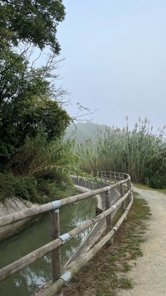 Heading out of this zone, I turned onto a side street which quickly became a small trail, cutting uphill through a stand of trees. Emerging on the other side and ducking under a pergola of vines, I looked to my left and had my first view of the sea since Dover! Another remarkable reminder of the crazy distance I have covered in what feels like no time at all. I continued up further (the app describes this section as “flat,” ironically), passing two bikers resting in the shade near a sign advertising a barbecue.
