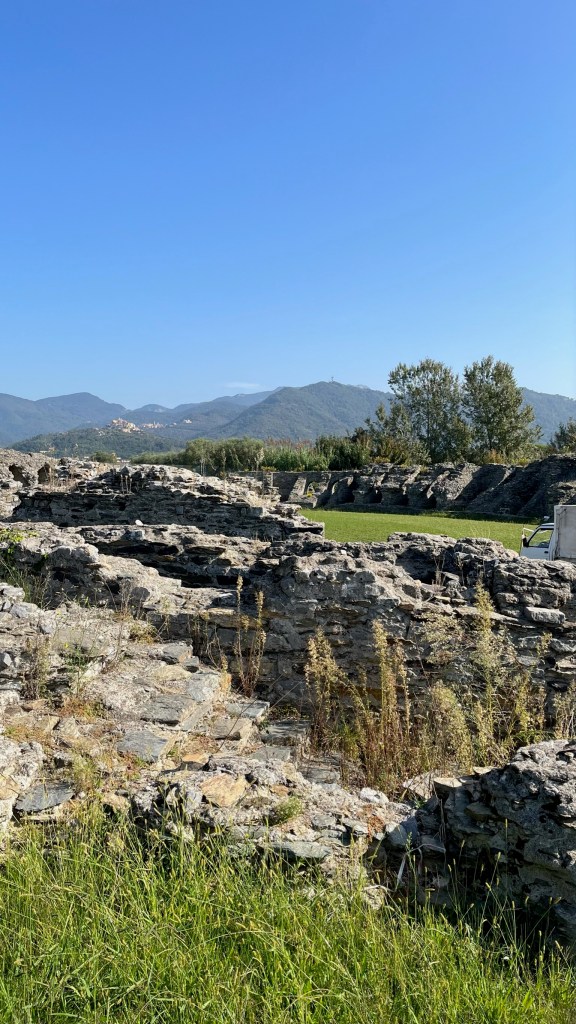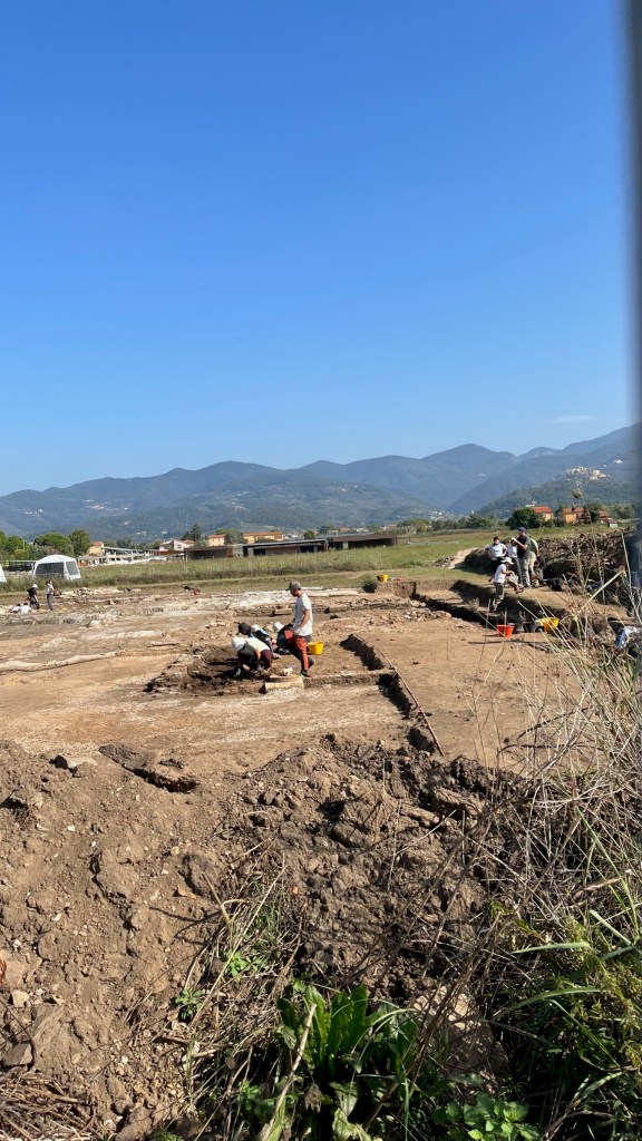 Looking to break up some of the monotony, I stopped at a bar on the busy Via Aurelia (the highway that traces the path of the original Roman road) for a snack. Then I continued on through sunny fields, passing the entrance to the ruins of the city of the Roman city of Luni. Unfortunately they were closed, but I made my way around the edge of the complex, and through the fence saw a group of archaeologists hard at work.