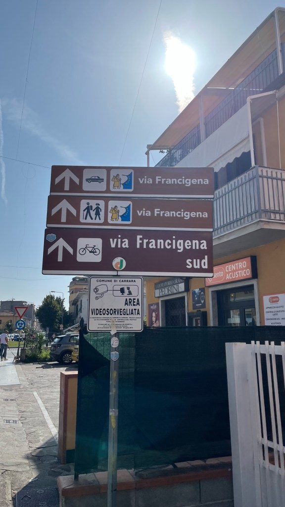 Then I unfortunately was back on roads. It turns out — I learned from a man who stopped me to chat — that the highway was closed for some reason, so all of the traffic had been diverted to side streets. And so, I made my way down the narrow sidewalk in the hot sun with cars flying by, dangerously close. Frustrated, I set my sights on the town of Avenza and pushed onward. On the way into town, I passed a trio of Via Francigena signs advertising the walking, biking, and driving routes. In the immortal words of my friend Ricardo, I think the driving route is deeply unserious. Look, I’m no pilgrimage purist — obviously —- but I do think a certain amount of difficulty is involved in differentiating between a pilgrimage and a holiday. Driving around Tuscany along what happens to be the VF route, in my opinion, is a bridge too far to be considered an actual pilgrimage. (All of this with the normal caveats that, maybe for someone who is physically unable to walk or bike, this is the only way to experience the VF…)