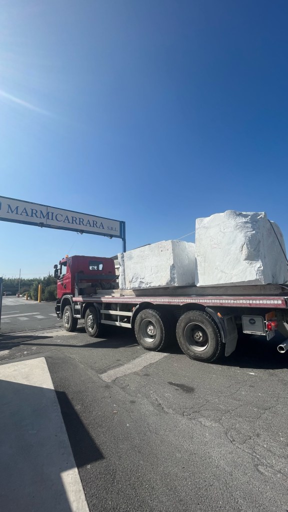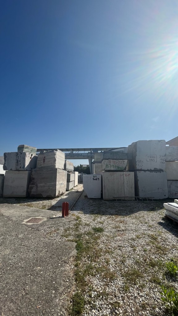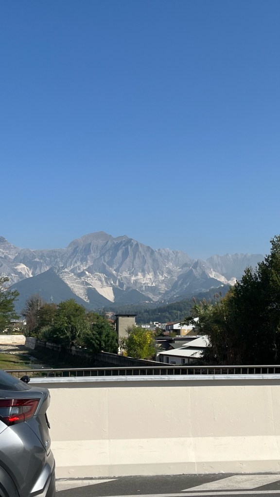After eating and changing socks, I quickly packed up and made my way out of Avenza, across the train tracks and into a truly industrial area. I was in marble territory now — the quarries of Carrara were visible high above me in the mountains, and I walked by large warehouses where gigantic blocks of marble sat, waiting to be cut into sheets to be used for countertops and tiles. I thought it was a remarkable view of an ancient industry — even in pre-Roman times, “Luna marble” was famous — as a truck rumbled by, bringing even more blocks of stone from the hills.