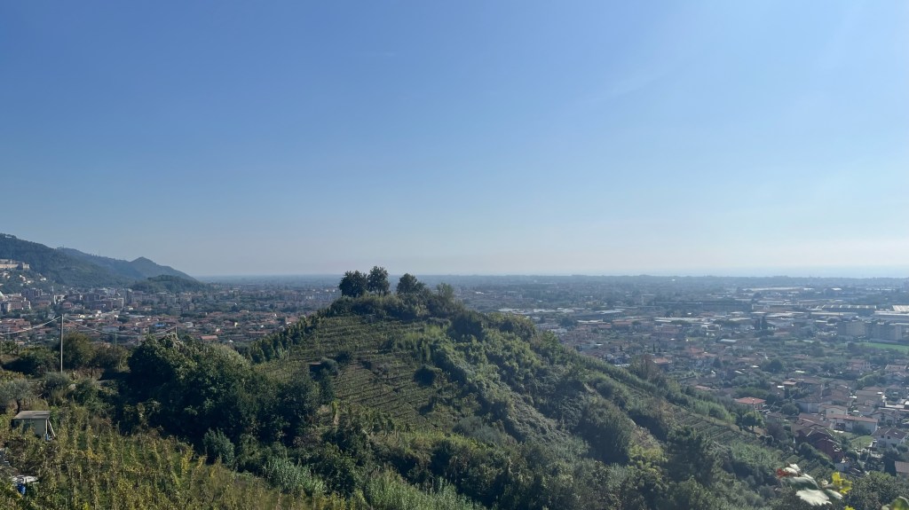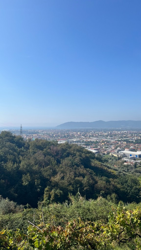 And, suddenly, I was properly back in wine territory. Looking ahead of me towards Massa were rows and rows of vines carpeting the foothills. To my right, vast urban sprawl and then the sea, which glowed in the midday light. To my left, the spines of mountains like those I crossed a few days ago.