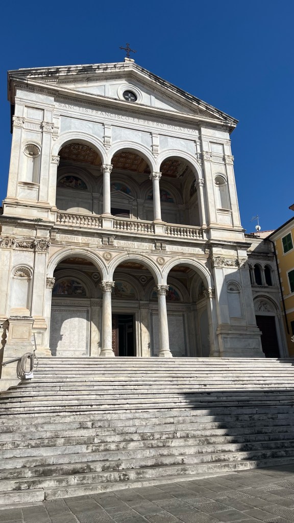 I got the impression that Avenza — or at least its outskirts, though it doesn’t really have a centro storico — is a bit seedy. This makes sense as it sort of bleeds into a larger industrial area running along the coast. Either way, I struggled a bit before finally finding an open bakery, where I bought a tomato focaccia — not quite a pizza — for lunch, which I ate in a piazza as an old man on a scooter stared at me.