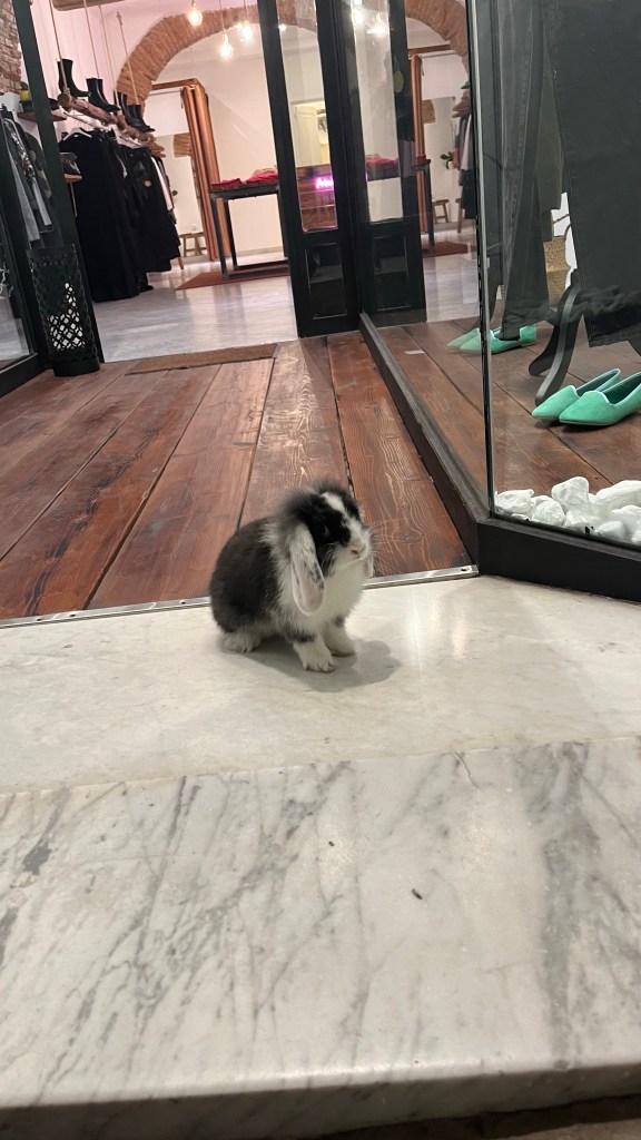 After checking in and getting settled (I am sharing a room with the Genji, the man from Japan), I headed out for a quick walk to visit the interior of the church, which uses much less marble than I was expecting. I found that after 17 miles or so my feet and knees were tired of walking, and my hamstring (which had been bothering me in Switzerland) was making itself known again. So, I parked myself at a cafe where I snacked on a crepe and read, before heading back out in search of aperitivo and dinner. I had a glass of wine at a bar and chatted with my dad on the phone, before moving just up the street to a restaurant. In the interim, I and a large, muscly Italian man stumbled upon a rabbit hanging out outside one of the shops. We stopped to pet the rabbit, whose owner eventually came over and introduced him as Dante — only 4 months old, he is already trained enough to hop around outside of her shop without a leash!