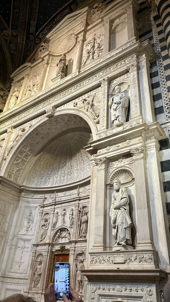 I bought a combined ticket to Siena’s Cathedral complex and made my way in. To be honest, it was a bit of a miserable experience visiting the Duomo. Don’t get me wrong, the structure itself is beautiful: mesmerizing black-and-white striped marble columns, intricate mosaic floors, sculptures by Michelangelo and Bernini….but the place was completely overcrowded, stuffed to the brim with groups of guided tours who clogged up the walkways. To make matters worse, these groups would chat amongst themselves, over the din of the guides speaking into their microphones. In the expansive space the sound rebounded, and the cavernous nave was full of the sound of chatter in what should have been a sacred space. Frustrated by the crowds and the noise, I squeezed my way into the Chigi chapel to see Bernini’s St. Jerome and Mary Magdalene, into the Piccolomini library to see fantastic frescos and 15th century massive books, and elbowed my way towards the floor mosaics of the Sybils. Feeling I had seen enough, I escaped into fresh air.
