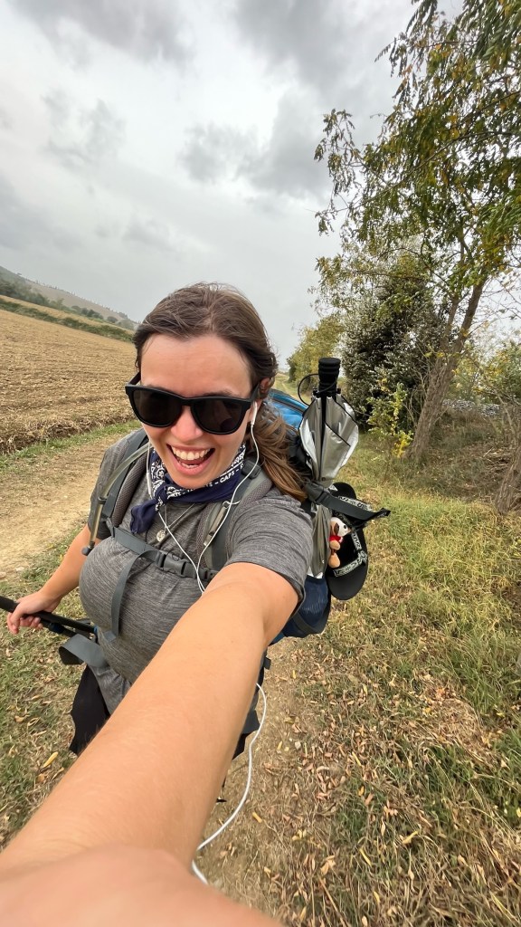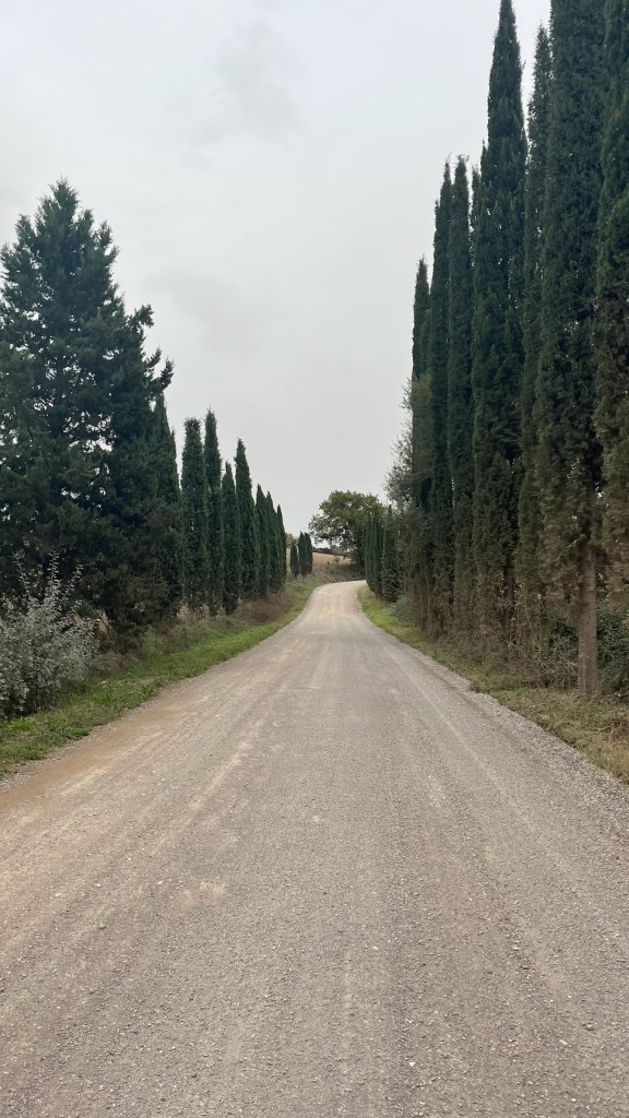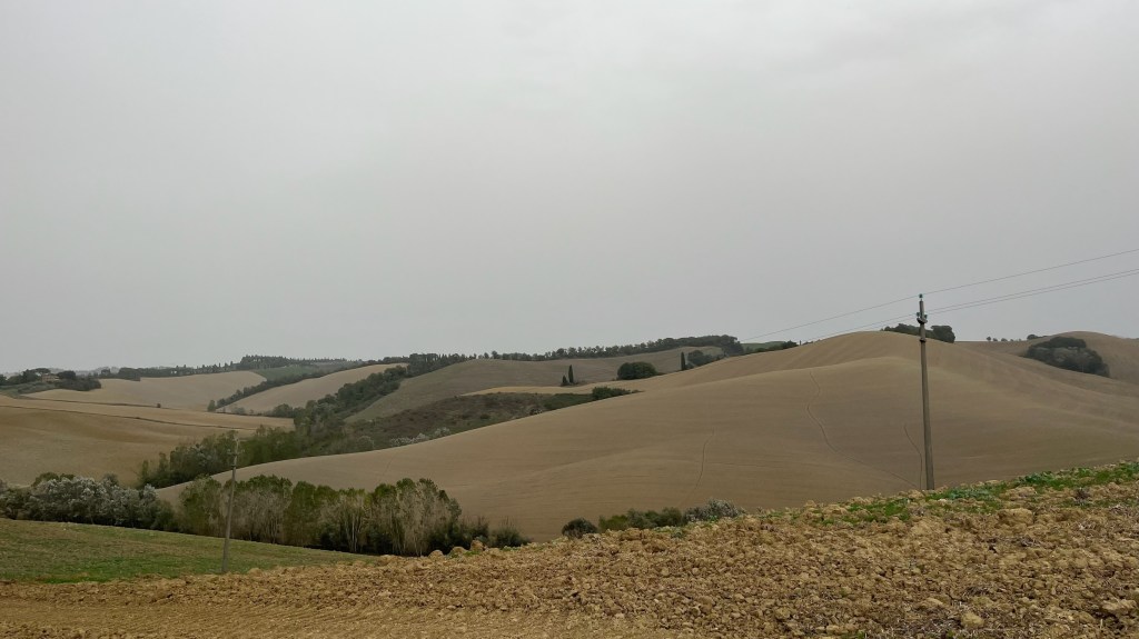 From here, I followed rolling hills, strade bianche lined with cypress trees, with expansive views of the Tuscan countryside. This section was endless brown until the hazy horizon, with hillsides that seemed to almost move like rippling fabric. But the endless brown of tilled fields and dead grass gave everything a desolate, almost surreal air. It was beautiful, but sort of unsettling almost. This was aided also by the clouds which gathered on the horizon and the wind which whooped up around me, sending my hair flying and also making me speed up to try and out-walk an incoming story. Up and down I went, seemingly the only person on the planet, until I turned around and spotted the silhouette of a pilgrim far behind me on the path.