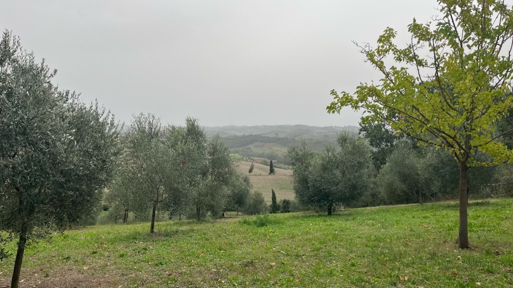 Piazza del Campo was basically empty as I stopped to admire the view one last time, and after a quick stop for coffee and a croissant I was heading out of town, through narrow streets and then suburban sprawl. Occasionally diving out of the way of speeding cars on the narrow road, I eventually found myself fully out in the country, walking along a ridge line. To either side were olive groves and fields, and behind me was a fantastic view back towards the Sienese skyline. Through the grey haze that hung over everything, I could just make out the towers of the Duomo and Piazza del Campo — their tops reaching the same height, to signify the balance of church and state.