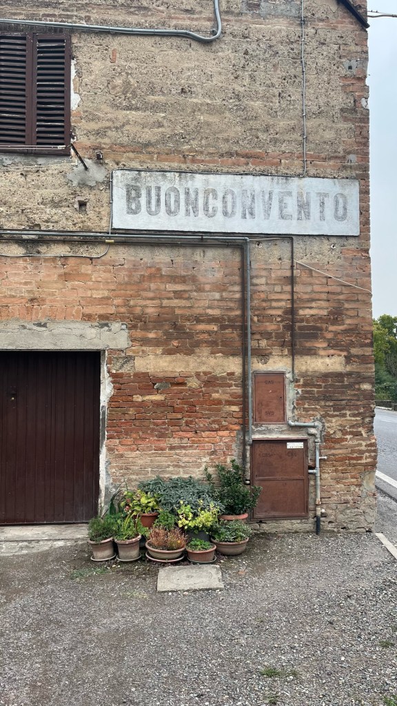 With the wind in my face and the occasional raindrop threatening, I made my way into Ponte d’Arbia and parked myself at a bar for a ginger beer and Gatorade. But the weather was starting to look worse and worse, and nervous about getting caught in a storm, I decided to ignore my pained feet and push on. The path took me once again across the busy Via Cassia, up and down hills with more views to the surrounding countryside, which had become much greener already. Tomorrow I will be properly walking in the vineyards of Brunello di Montalcino. After 40 minutes of more up-and-down, I crested a hill and could see the town of Buonconvento below, and after dodging more Via Cassia traffic I made my way into the charming medieval center, which is essentially one Main Street.