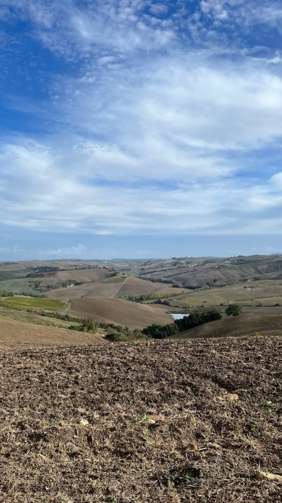 Finally admitting defeat, I continued to squelch my way along the path, past a winery offering a “pilgrim special” of a glass of wine, a sandwich, and a bottle of water for 8 euro. Not bad, but not particularly appealing at 8:30 am, so I continued onward. Heading up a hill I was once again greeted with stunning views of Montalcino, and green hills as far as the eye could see in one direction. in the other, were the rolling brown fields more typical of the Val d’Orcia, like I had seen yesterday. All of this was captured under a bright blue sky and picture-perfect puffy white clouds. I couldn’t believe my luck.