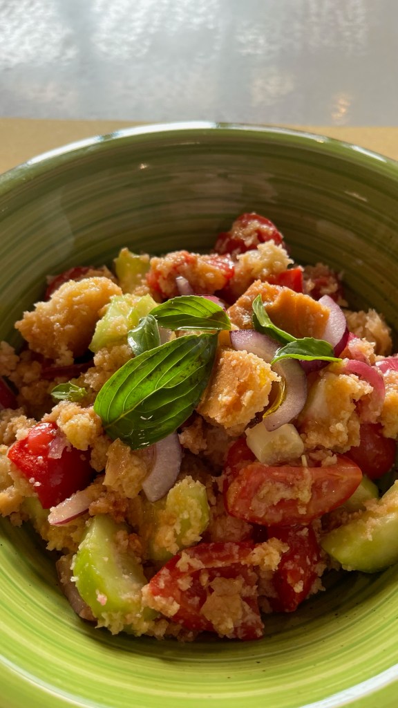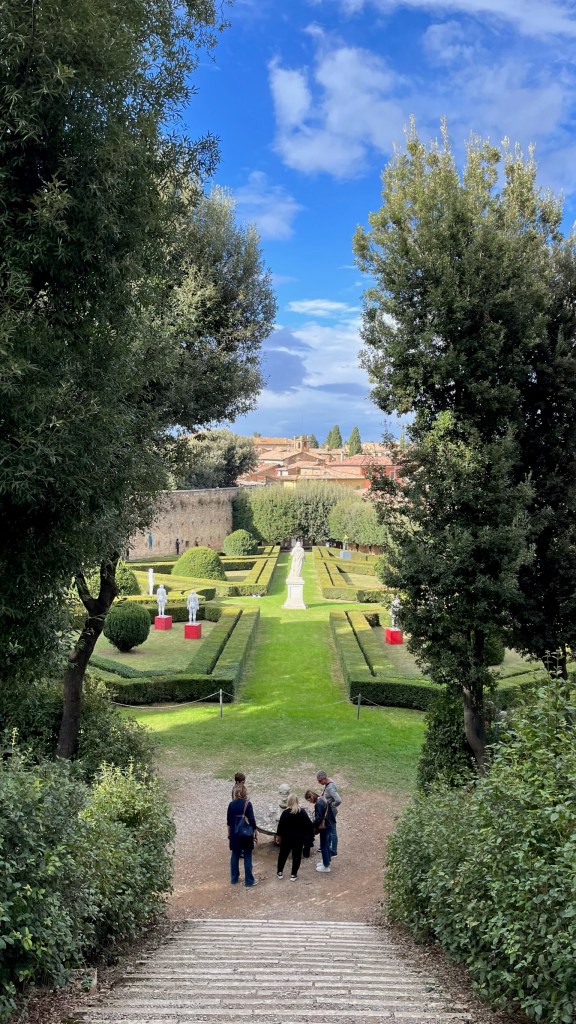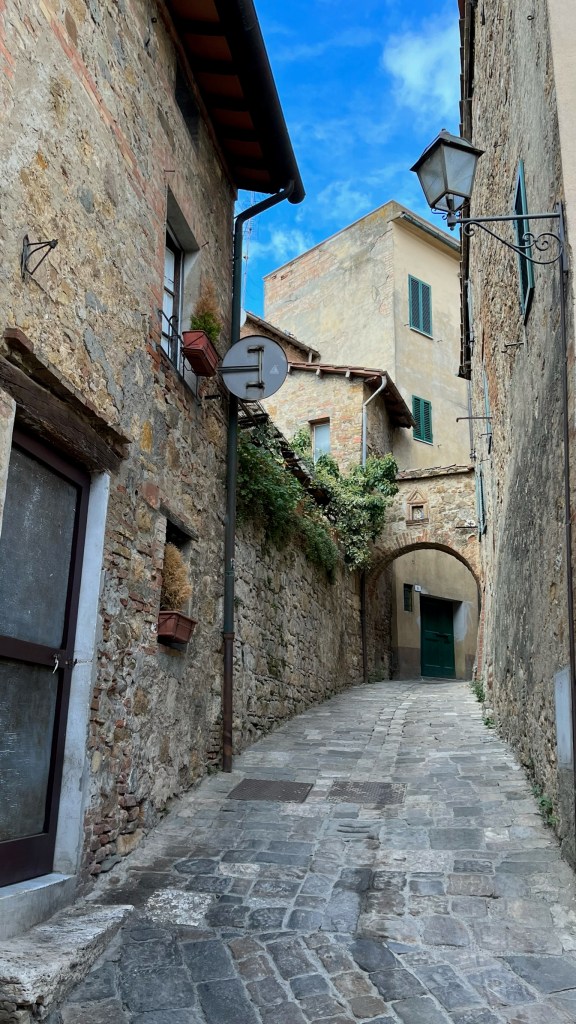 Earlier on the trail I had texted Nathan: “I am so hungry. All I want is a piece of bread toasted in olive oil, with some stracciatella and fresh shaved truffle on top. Is that so much to ask?” This craving had been nagging me for days — ever since San Miniato, actually, so maybe more like a week. So when I happened upon a bar that advertised bruschetta and fresh truffle, I knew I had to give it a try. After some pleading with the waiter, he consented, and I was brought an absolutely gigantic piece of bread covered in cheese and truffle. It was delicious (though they let the stracciatella heat up a bit too much, so it wasn’t perfect — but it very much satisfied the craving). Following it up with a panzanella for a bit of veg, I set off for a walk through the absolutely stunning streets of stone buildings, full of residences, B&Bs, and shops selling wine, cheese, and olive oil. After climbing up on some of the historical walls and wandering through the manicured gardens, I grabbed a gelato and headed back for a nap.