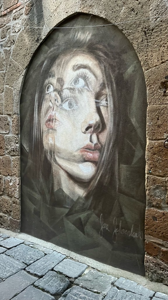 Afterwards I headed out to explore Acquapendente, which was almost entirely closed (it is a Monday, after all). I saw some interesting street art, which apparently the town is known for, and otherwise meandered the small streets. It’s immediately clear that we have crossed into Lazio from Tuscany. Tuscany, a wealthier region, is full of perfectly-manicured, beautiful towns. Acquapendente, like other towns in Lazio, is a bit grittier and rough around the edges — or at least hasn’t been pressure-washed. Buildings are still clad in grey plaster, without a layer of pastel paint on top. But I like this about these towns is that they give a visual into what life in Italy is like for many Italians, and what some of the bigger cities would have looked like a few decades ago. Acquapendente, in some streets, could substitute for Rome or Milan or Livorno in a film by Fellini, Antonioni, or Visconti.