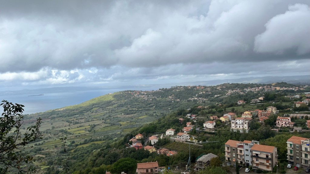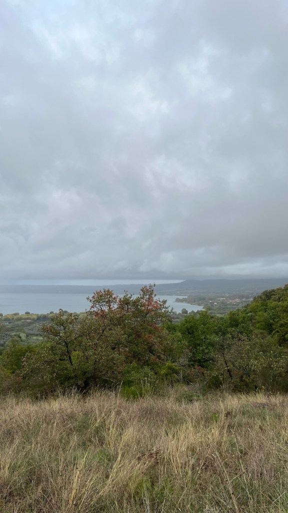 I admired it for awhile before continuing on, eventually emerging in an olive grove, where I had a short chat with a man out harvesting. He explained that the oil gets made from the olives as soon as possible, so he sometimes is going to get his olives pressed multiple times a week. After bidding him well I walked along the Via Cassia for a bit before cutting through more fields and emerging at a viewpoint with a view out over the lake and to Montefiascone ahead of me.