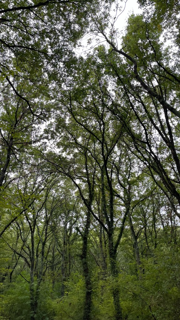 It was a short walking today today, with not so much to report. The trail started out rolling up and down hills with views out towards the lake, where a cloud hung threateningly low. It never fully committed to raining, though it did drizzle a few times. After an hour so of fields, I was plunged into another forest. This started out pretty normal: scrubby and reddish-brown from the dying leaves. Then, suddenly, I returned a corner and was struck by the change in scenery. The trees here were tall and serene, still green at the tops. underbrush was limited, giving a real sense of grandeur to the forest.