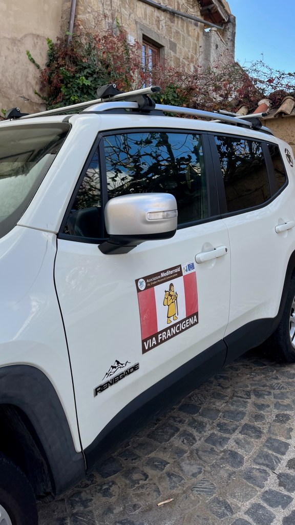 I am very much in the greater Rome fallout zone now. I could see the beginnings of it in Sutri — fancy cars and well-dressed couples. In Sutri I had a heavily-Botoxed woman give me and my pilgrim outfit the full up-and-down. And of course today’s town even has “Roma” in the name — this was historically where wealthy Romans would come to escape the city. Sort of the Hamptons of 15th-century Italy, if you will. So as I move in on my final destination, naturally I need some hype music to keep me “focused, looking forward…”